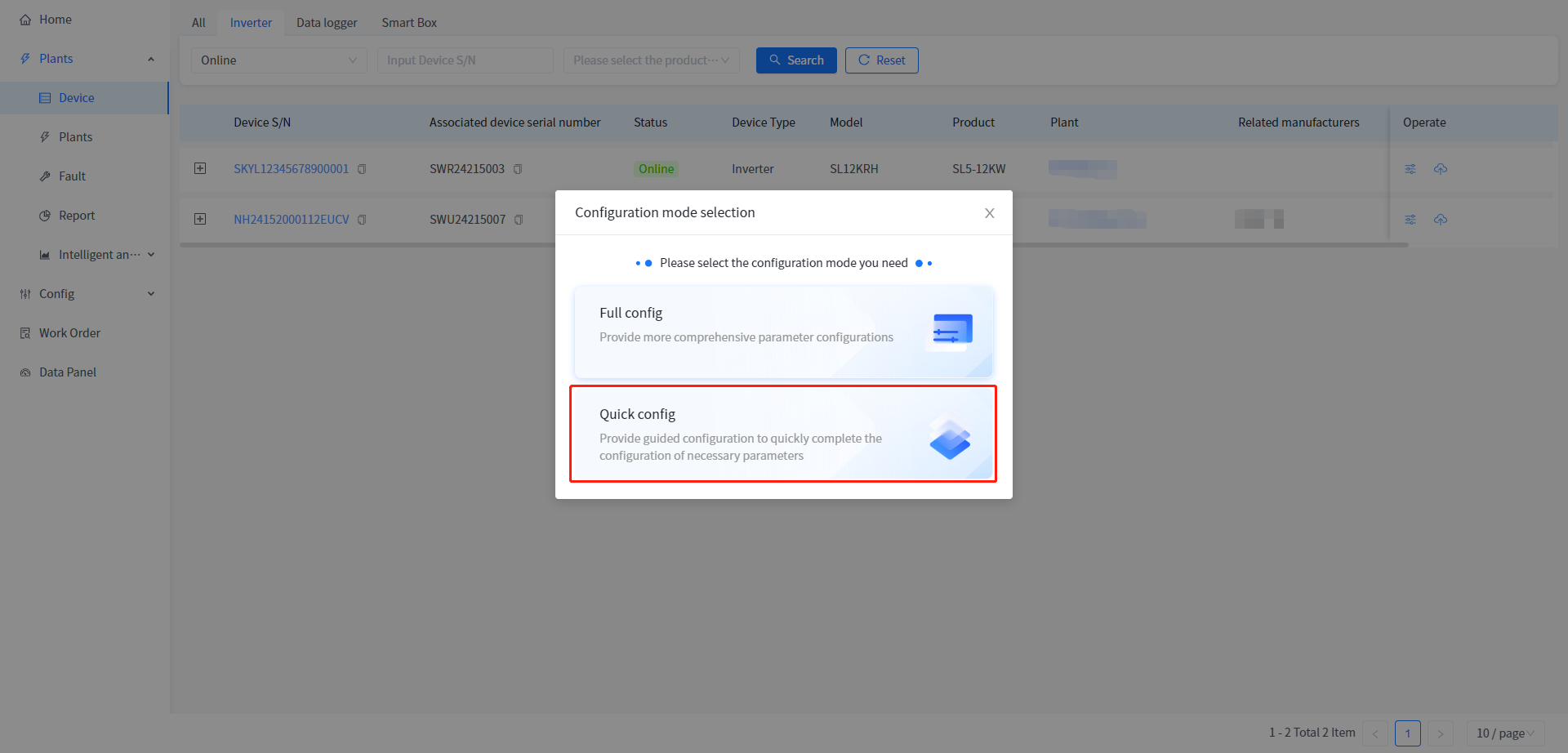 ② Click the [Parameter] button on the right. (If the device of this model supports quick configuration, then the configuration mode selection pop-up window will pop up after clicking the configuration button. If the device does not support quick configuration, the page will directly enter the parameter configuration page.)