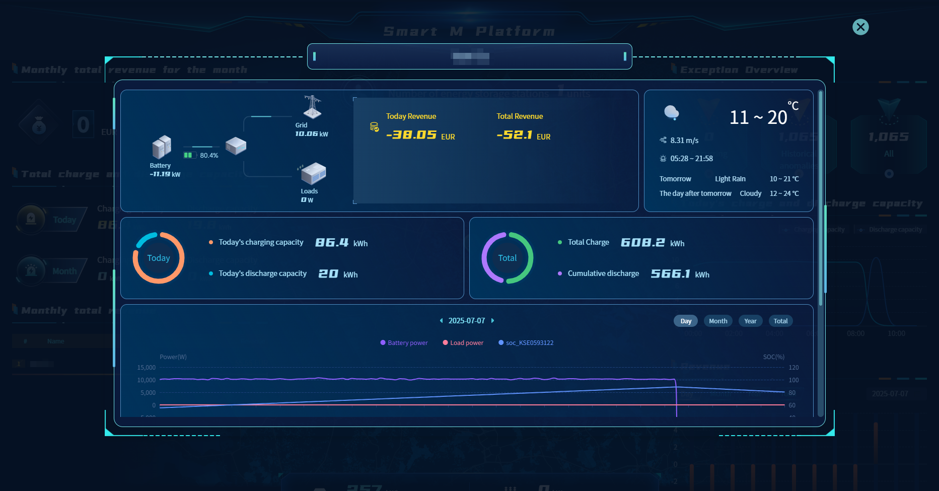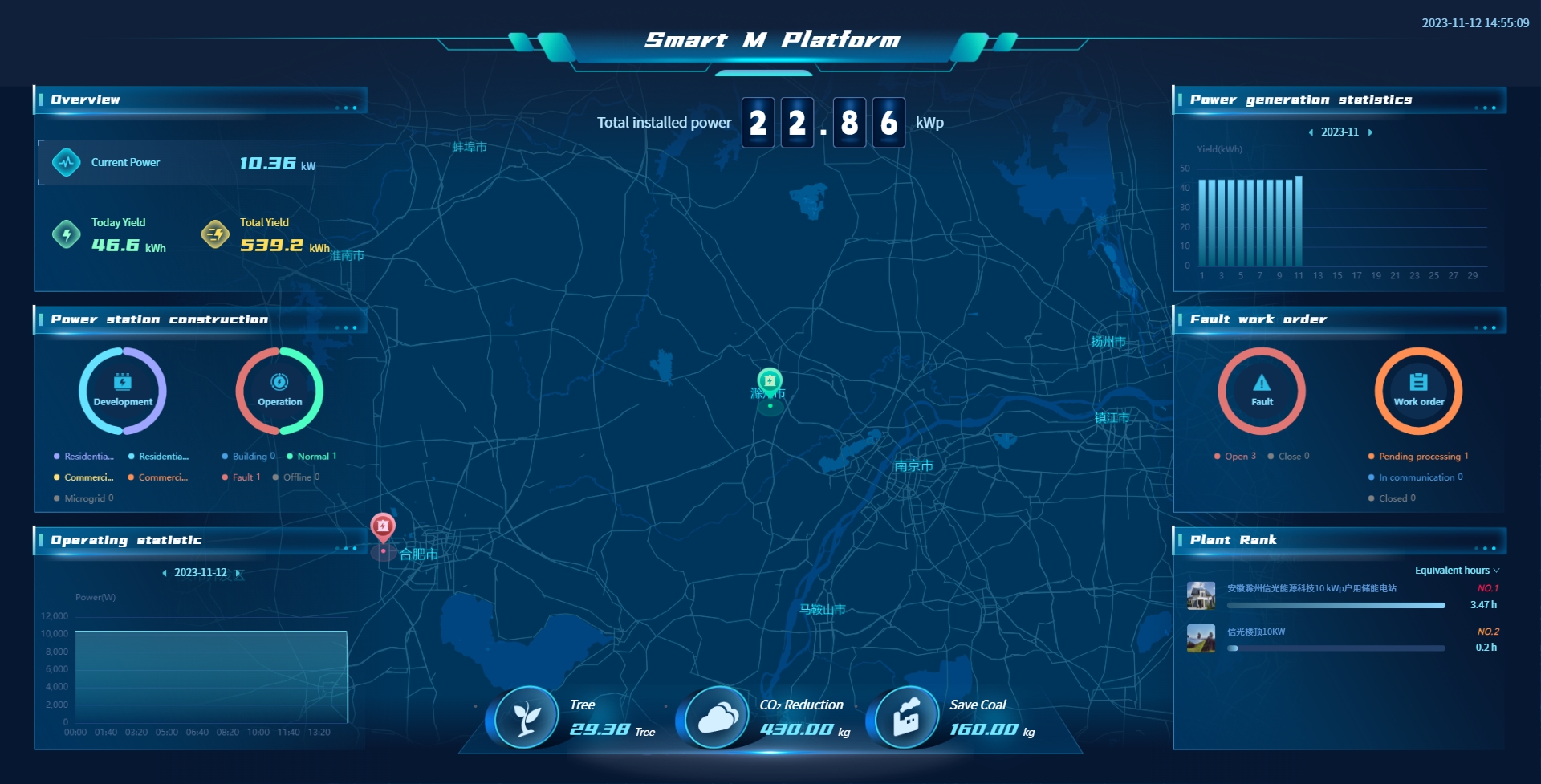 Smart M provides an intelligent large screen that integrates power plant monitoring, energy management, and data analysis, presenting real-time comprehensive information on power plant operations to help you better control energy management. Through rich data display and analysis functions, you can gain a deep understanding of the operational efficiency, power generation benefits, and energy-saving and emission reduction effects of power plants, while monitoring the status of power plants and faults worldwide.