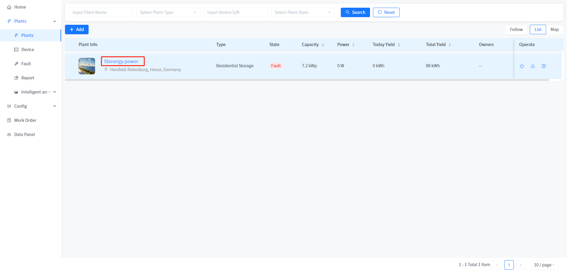 The system supports the viewing of individual plant information, device information, fault information, report statistics, and curve analysis data. You can click the plant name on the plant list page to access the plant overview page of plant details.