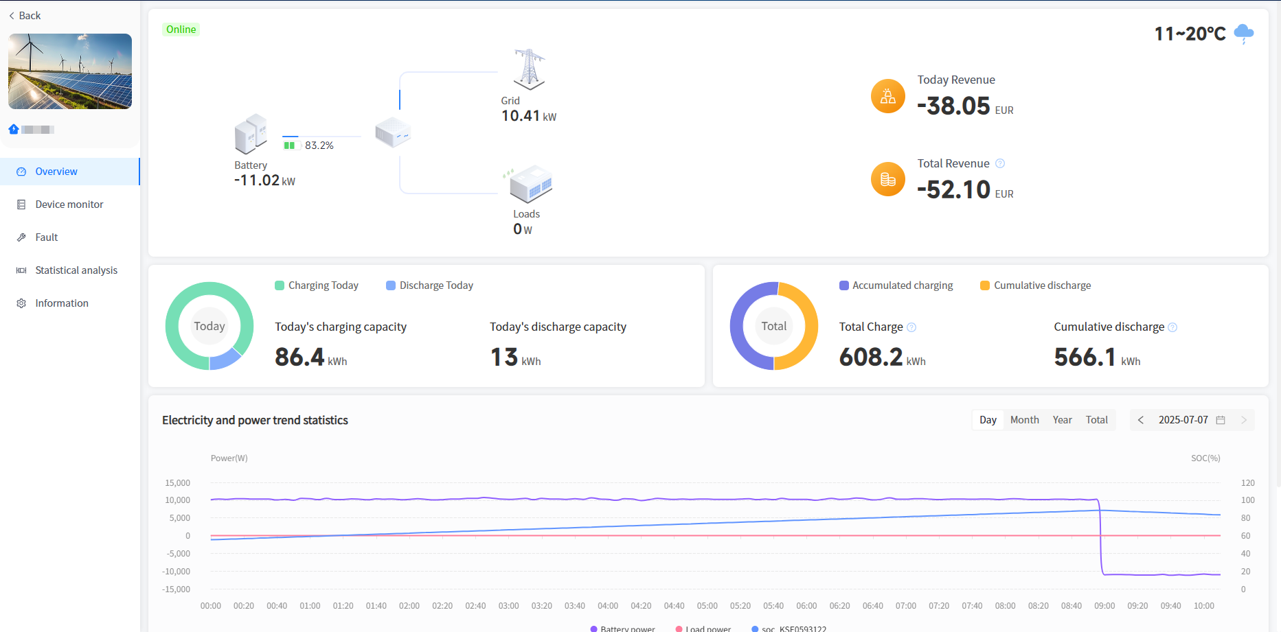 [Power Trend Statistics] Display the battery operating power and load power consumption statistics of all equipment in the power station, with an interval of 5 minutes.