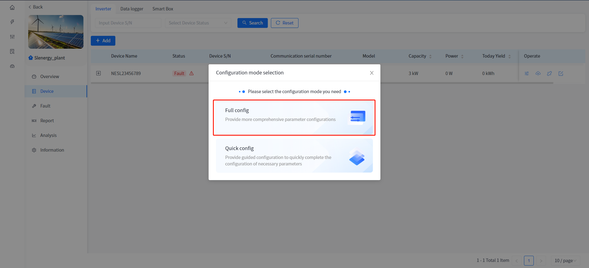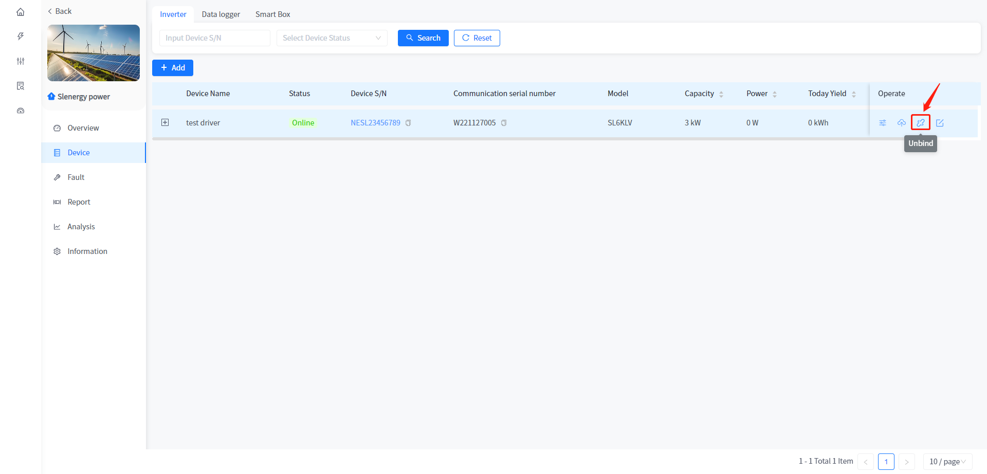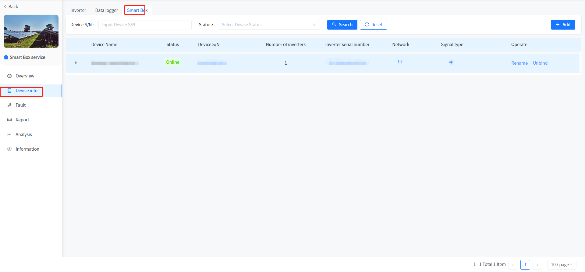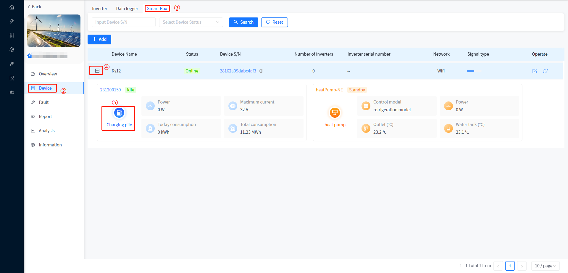 Add and associate Plants to Smart Box devices, as well as view data and configure parameters for associated heat pumps and charging stations under Smart Box. The addition of Smart Box devices is consistent with the addition of devices associated with the Plant, such as inverters.