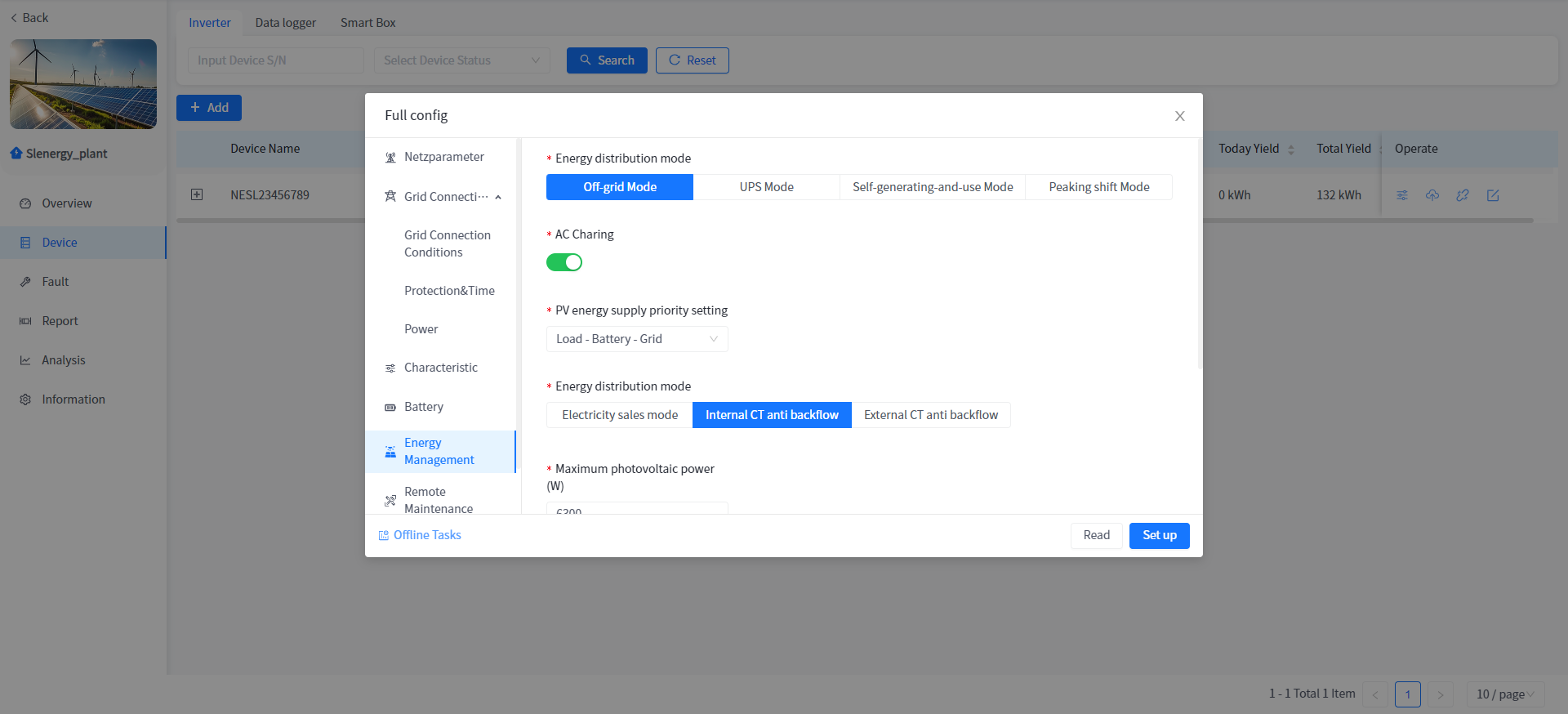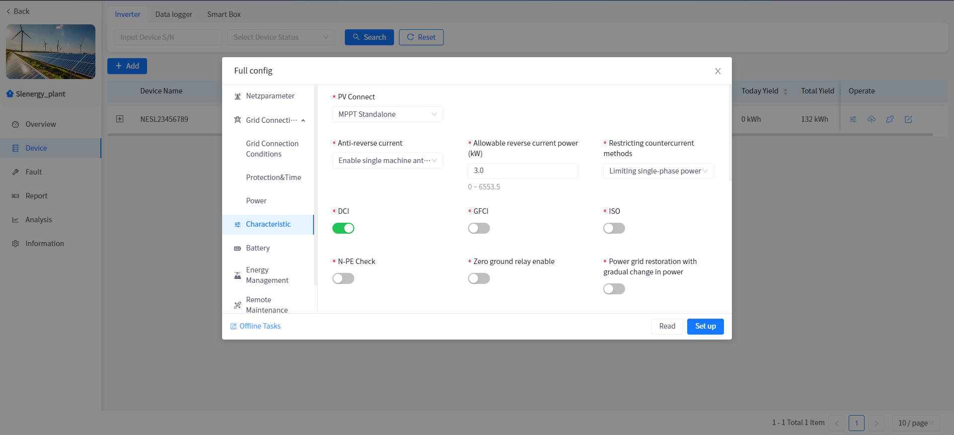 This system supports the operation of reading or setting the working parameters of the Device in the power plant Device details.