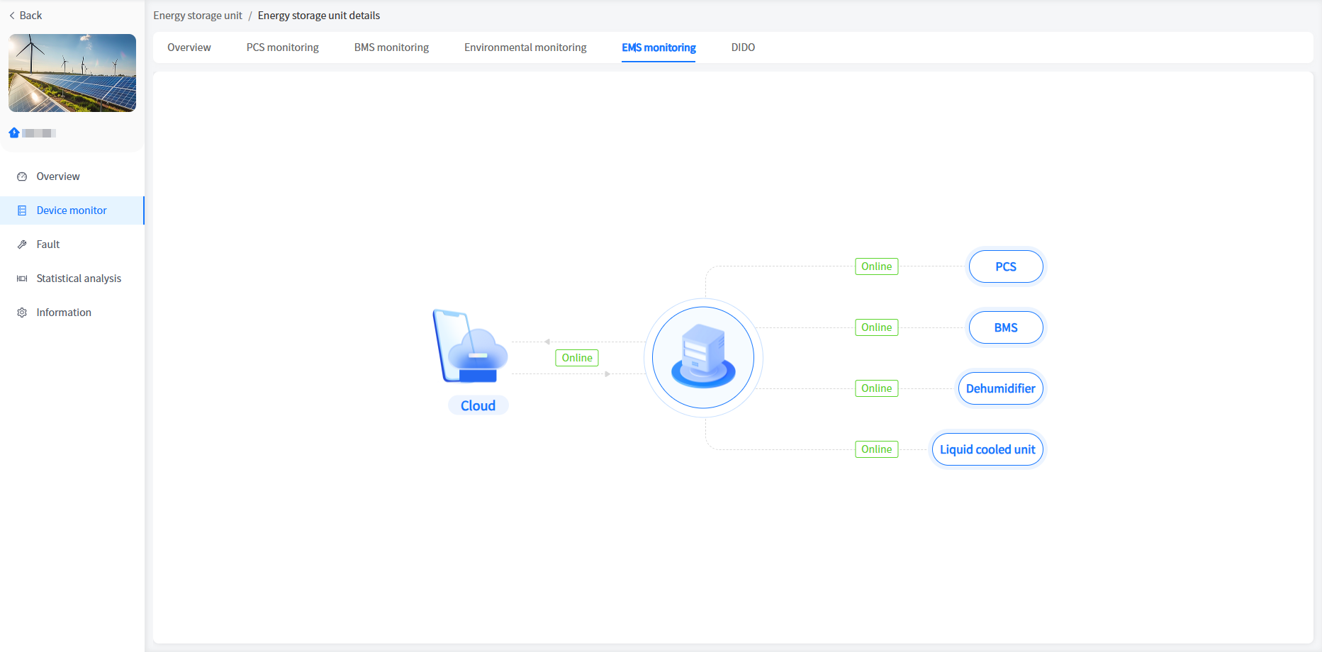 The system displays the communication status between devices and servers on the EMS monitoring page, as well as the communication status between PCS, BMS, dehumidifiers, and liquid coolers and EMS devices.