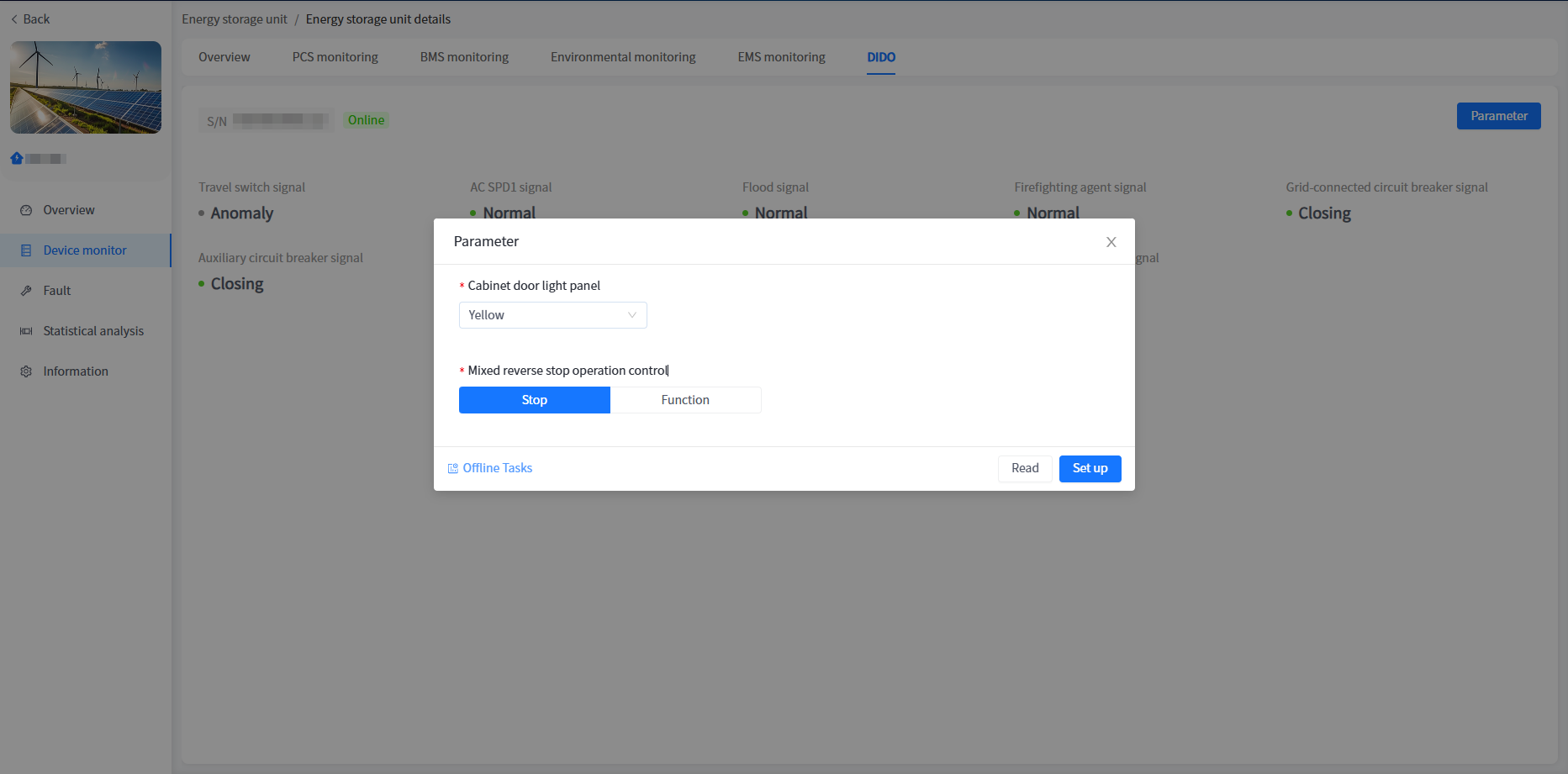 At present, only industrial and commercial storage cabinets are supported for parameter settings. The DIDO function of energy storage and voltage regulation cabinets is limited and does not support parameter settings. The specific parameters that can be set are as follows: