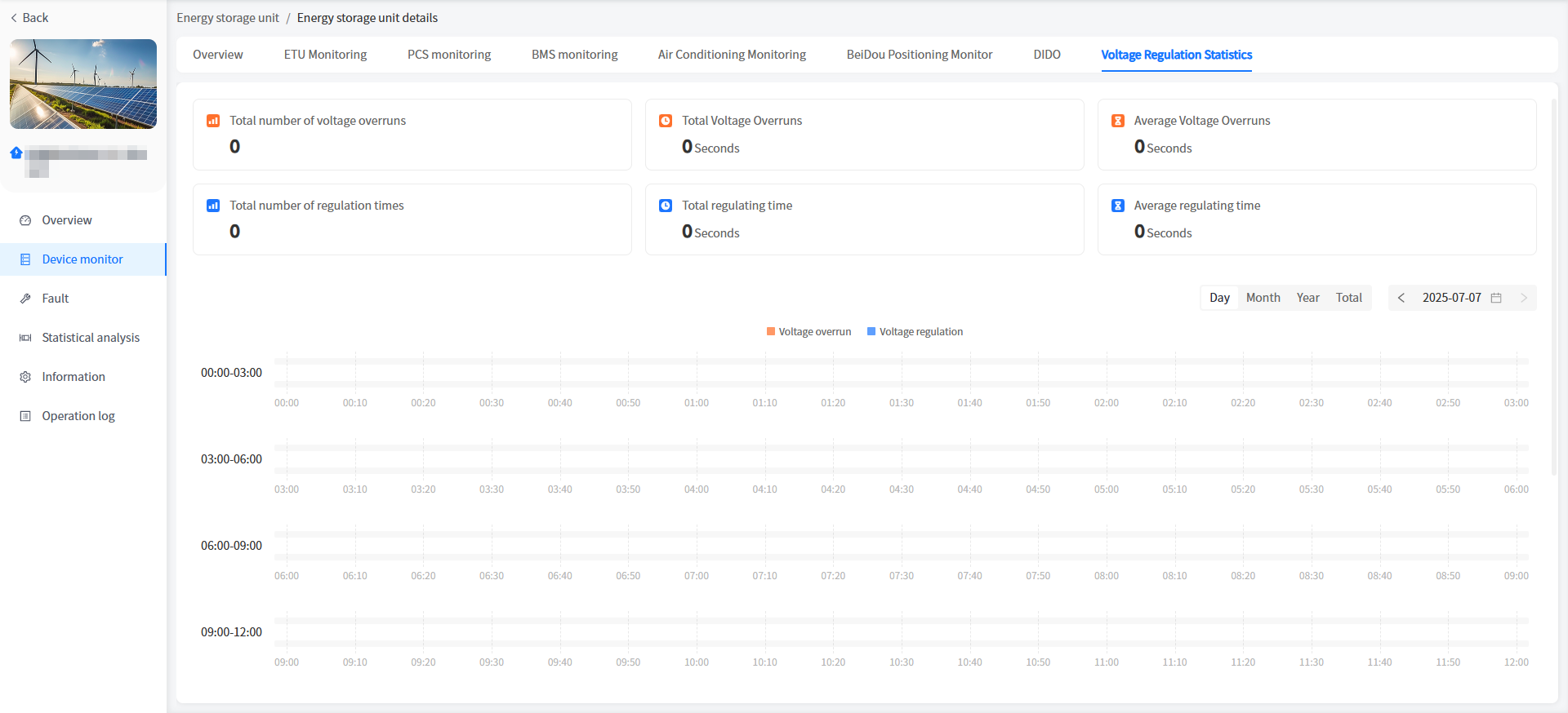 You can view the total voltage regulation data and regulation time data of the cabinet on the voltage regulation statistics page, which is convenient for you to understand the voltage regulation work of the machine.