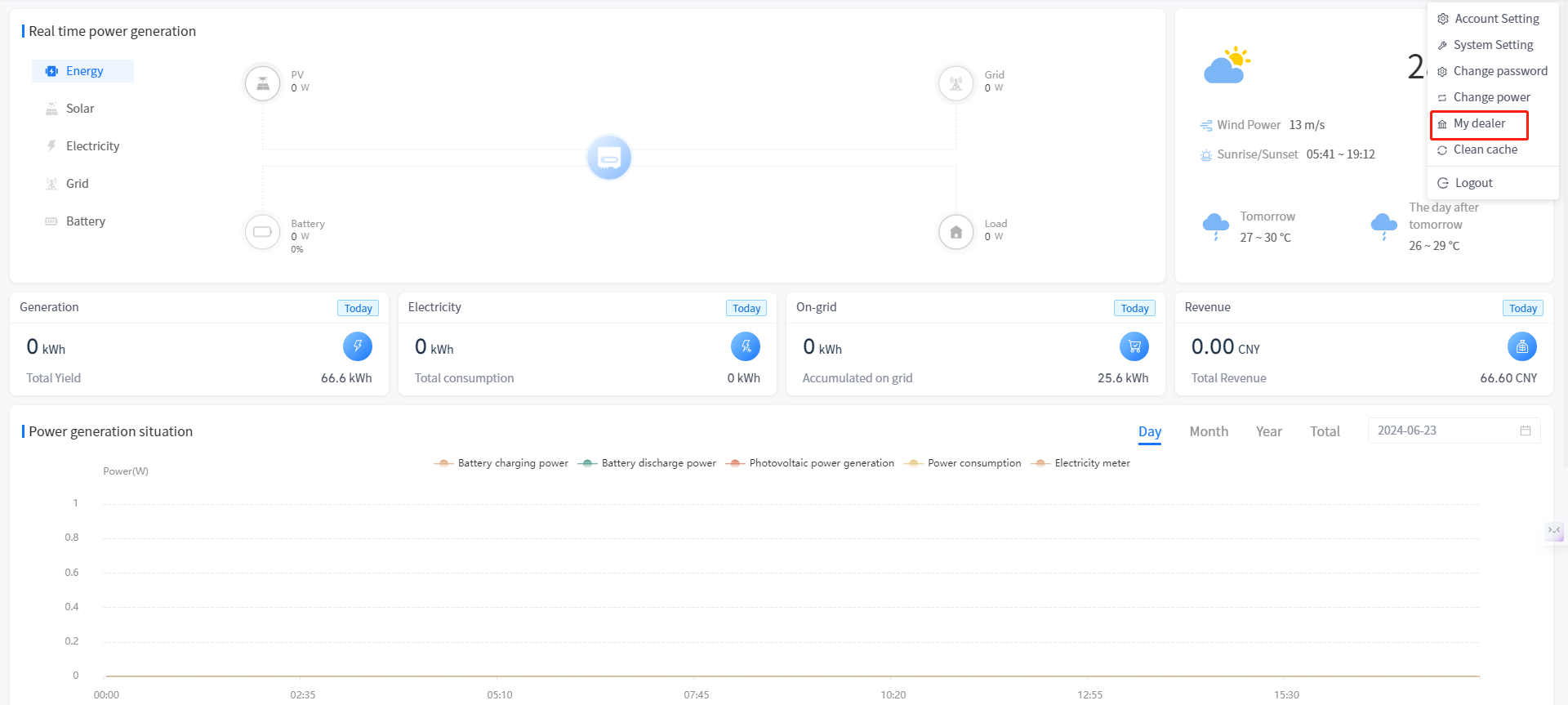 Slenergy Technology (A.H.) Co., Ltd. This system supports the owner to view the contact information of the power plant dealer in the My Dealer pop-up window, and open the pop-up window by clicking the [My Dealer] button in the welcome message in the upper right corner.