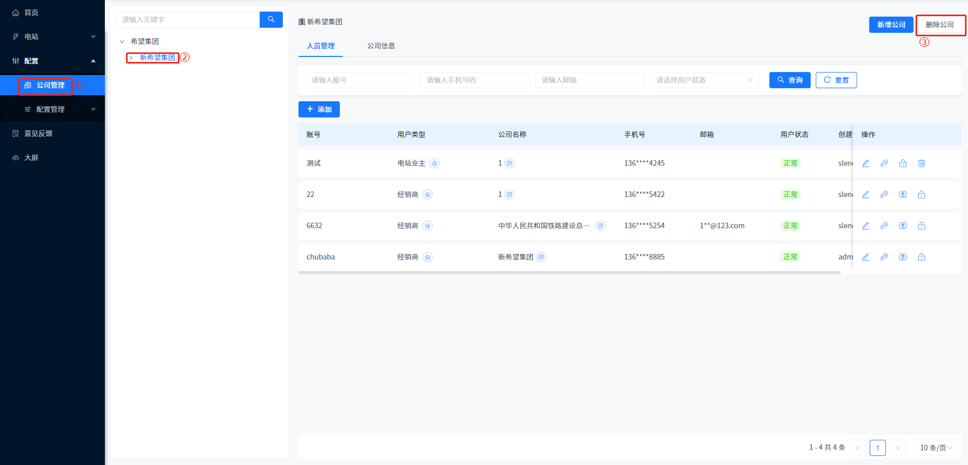 信光能源科技(安徽)有限公司 对系统内归属您的下级公司进行删除操作,公司删除时只能删除名下没有下级公司和人员的公司,如果有人员或者公司下级,无法删除。