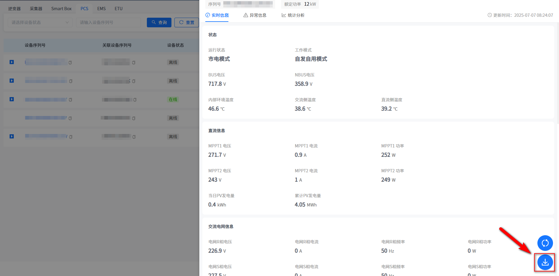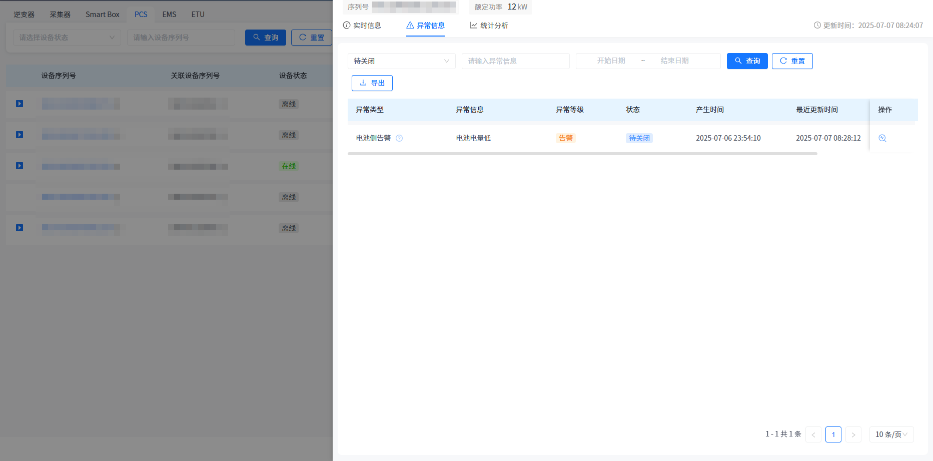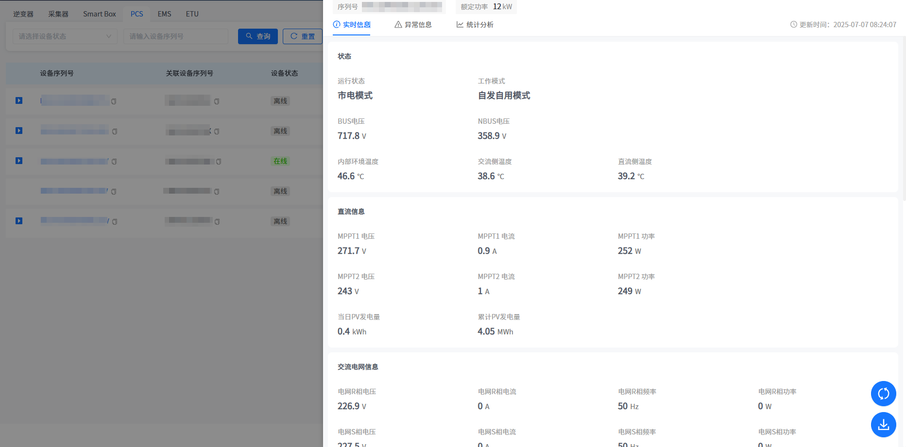 本系统支持在电站-设备内,查看PCS设备实时的信息数据;支持在设备详情内查看故障详情和查看故障发生原因;支持查看该设备的统计数据。