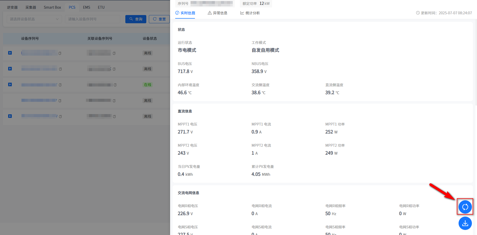 为了方便您能够实时了解到逆变器的工作数据,系统在实时信息页面右下脚增加了一个刷新按钮,通过点击该按钮,系统可以获取到当前时间点逆变器的工作数据展示到您。