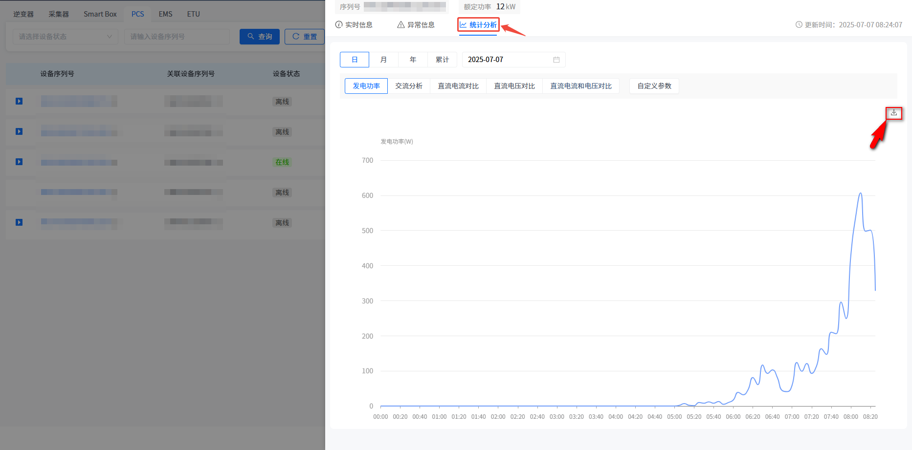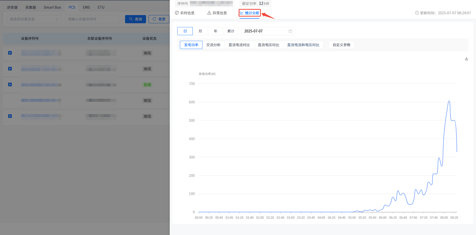 本系统在电站-设备-详情页面中以折线图的方式展示了该设备的当前时间实时功率、历史功率、历史发电量、交流分析、直流电流对比、直流电压对比、直流电流和电压对比以及自定义参数。