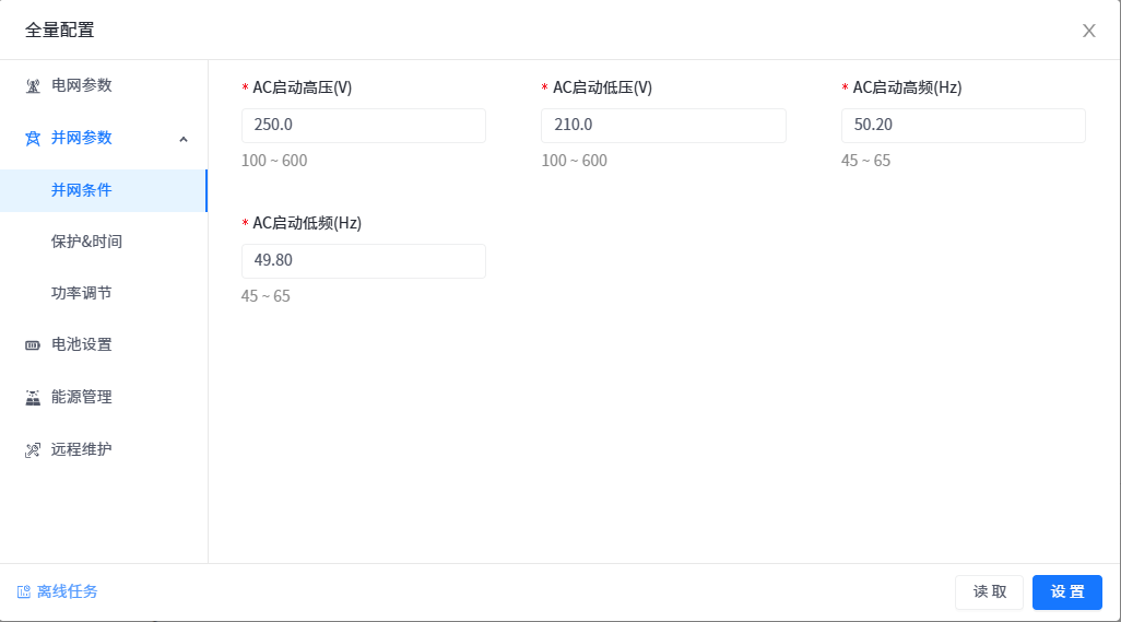 | AC启动高压(V) | 机器能并网的最高市电电压。并网前机器若检测到市电电压超过此电压,将无法并网(设置法规会自动修改至对应法规设置值,不建议用户修改) | 100V-600V,最小单位0.1V |