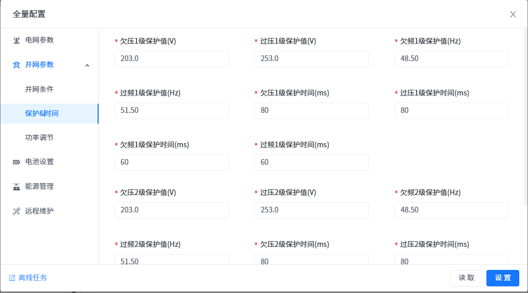 | 过压3级保护时间(ms) | 从市电3级过压到机器保护所用的时间(设置法规会自动修改至对应法规设置值,不建议用户修改) | 最低设置20ms |