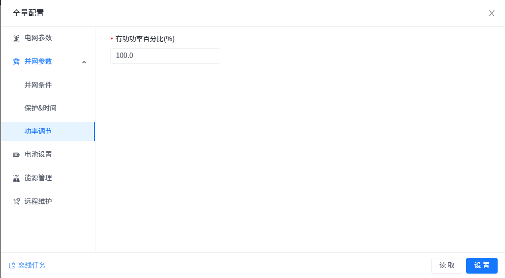 | 电池放电功率(kW) | 设置电池最大放电功率 | 最低0.1kW |