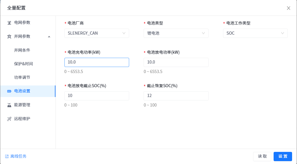 | 电池充电功率(kW) | 设置电池最大充电功率 | 最低0.1kW |