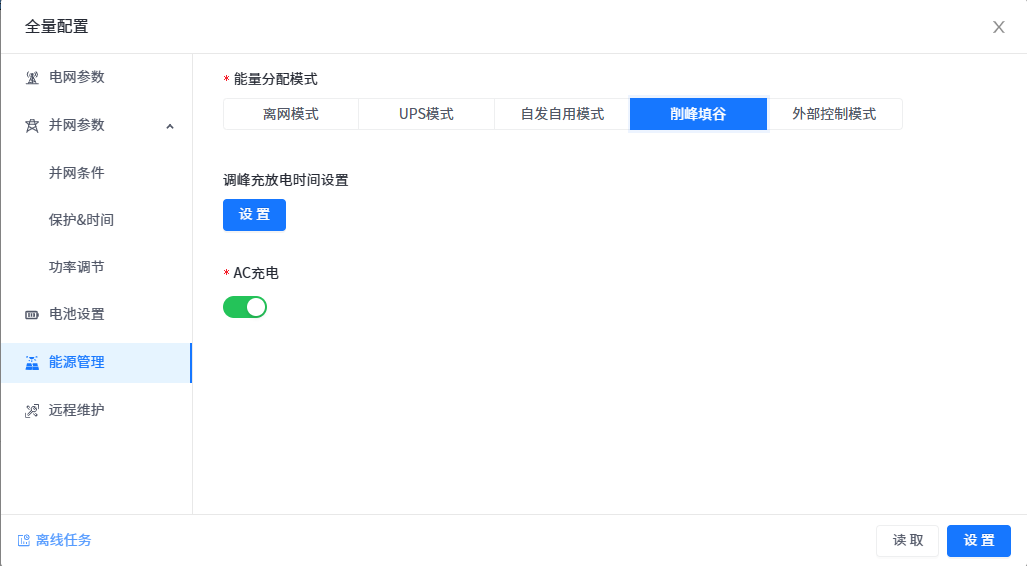 | 电网调峰 | 使能后开启电网调峰功能 | 开启/关闭 |