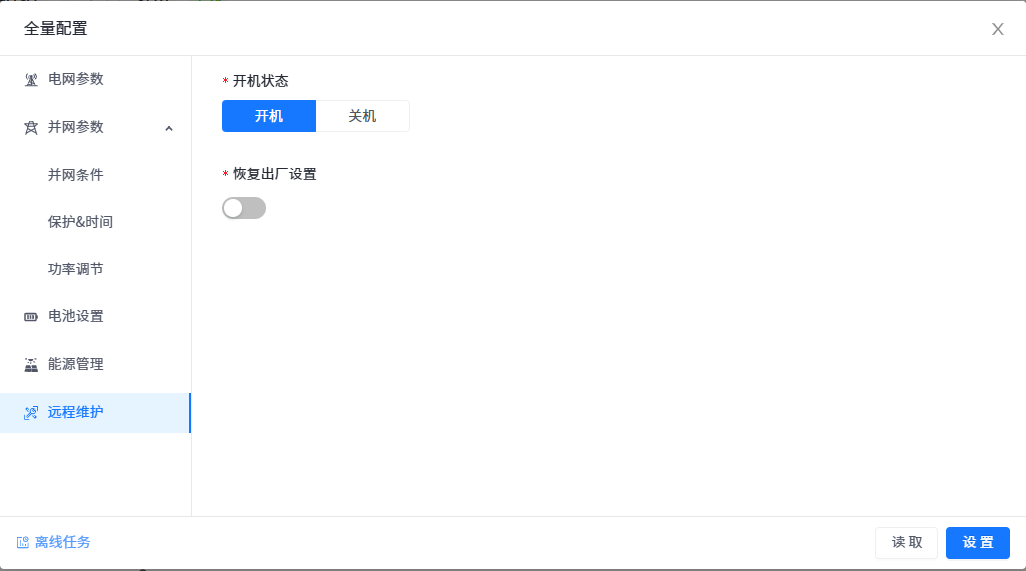 | 电池并网开关 | 使能后,总并网开关同时使能,机器电池能够并网 | 开启/关闭 |