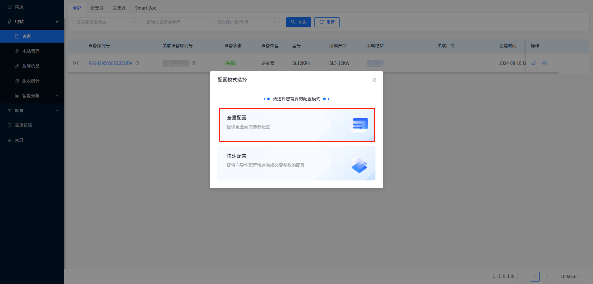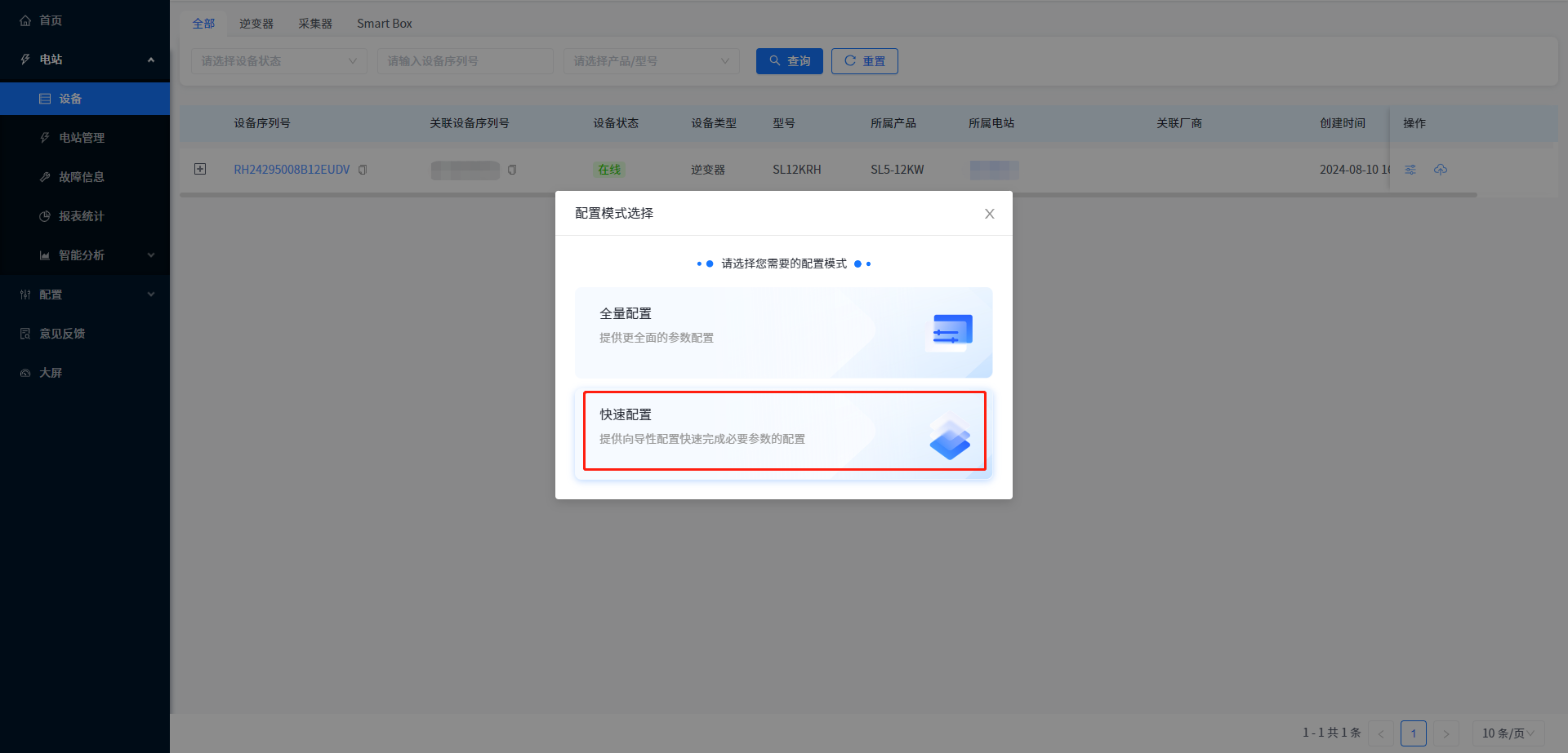 ② 点击右侧[配置]按钮。(如果该型号设备支持快速配置,那么点击配置按钮之后会弹出配置模式选择弹窗,如果不支持快速配置,那么页面直接进入参数配置页面。)