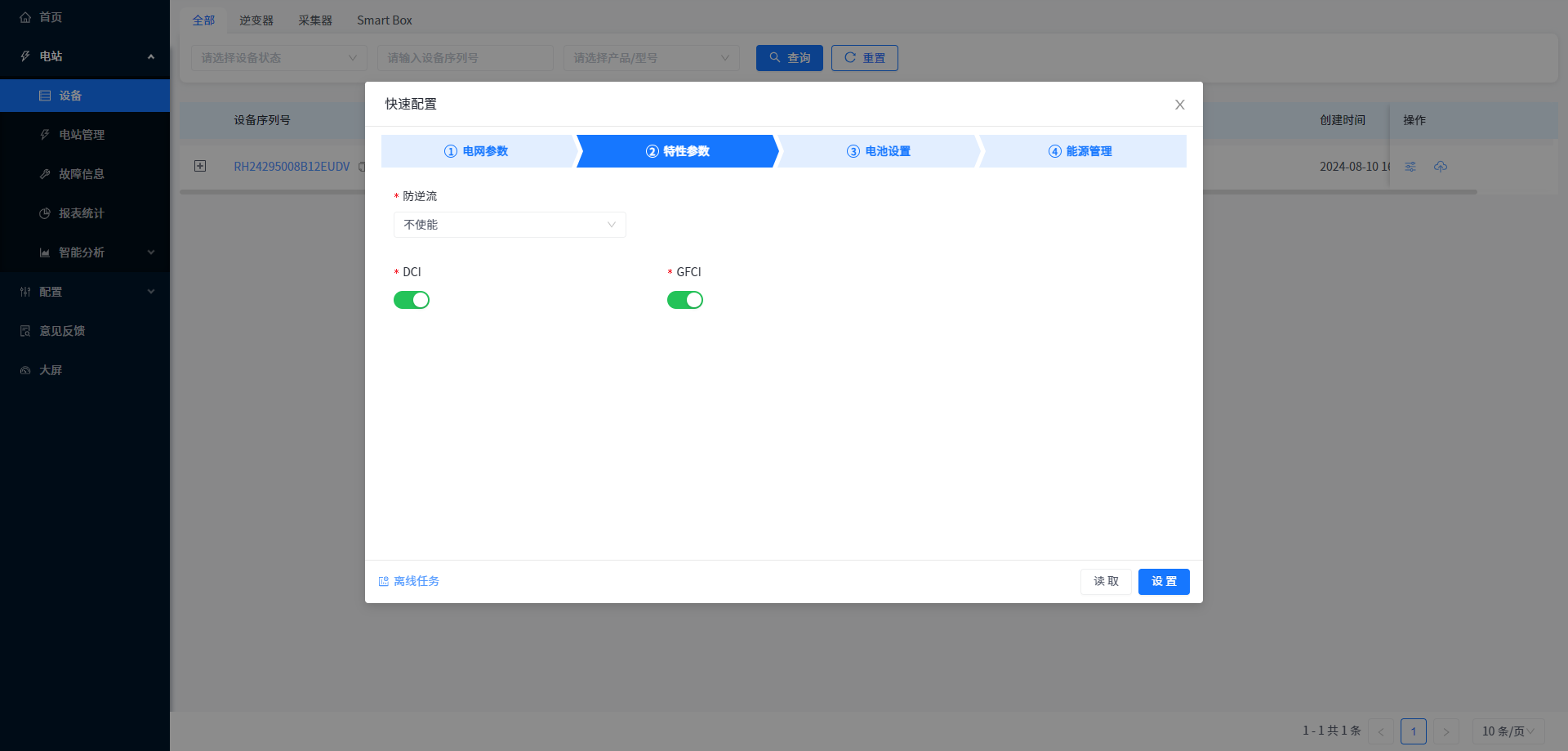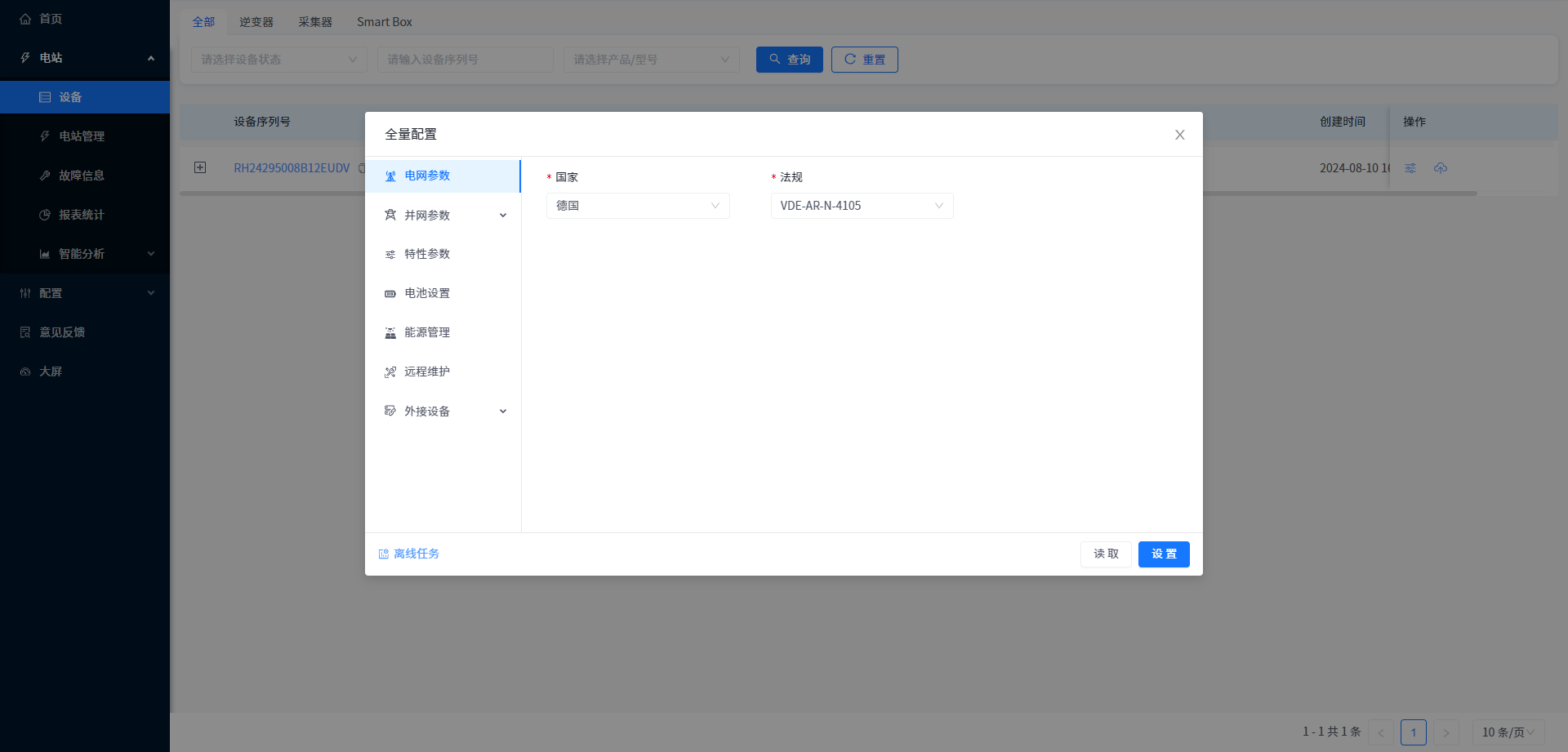 本系统支持在电站-设备管理内,对设备工作参数进行读取、设置和设备自检(仅支持部分型号设备)的操作。(具体的参数含义和可设定范围请查看附录:参数说明)