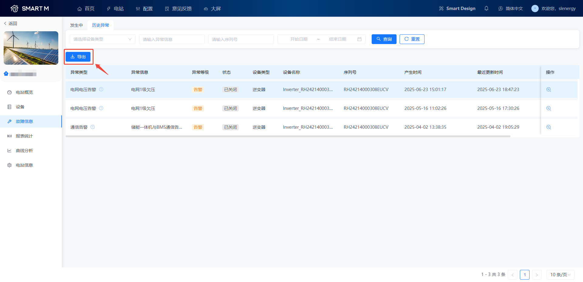 Smart M在电站详情-故障信息页面中,展示该电站关联所有设备的故障数据。