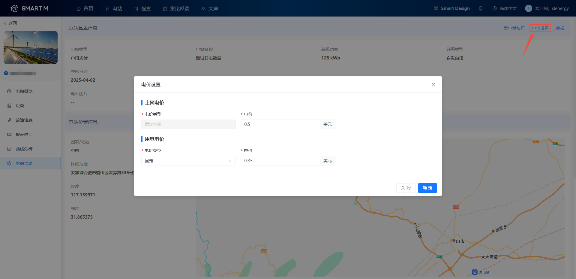 ④ 您可以在弹出电价设置页面中输入上网电价和用电电价(用电电价类型分为固定、按天分时和按月分时三种)