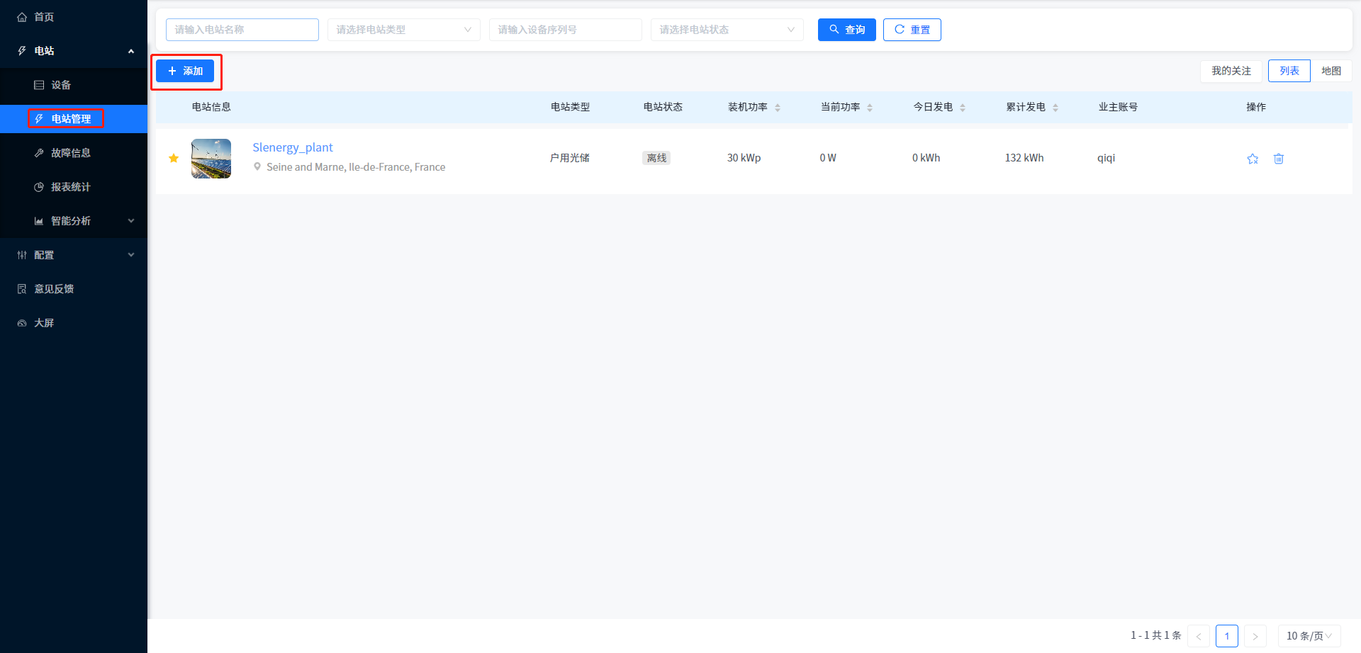 经销商用户点击电站列表左上角[添加]按钮进入信息录入页面,在信息录入页面填写符合规则的信息后点击[立即创建],提示成功后电站就创建好了。