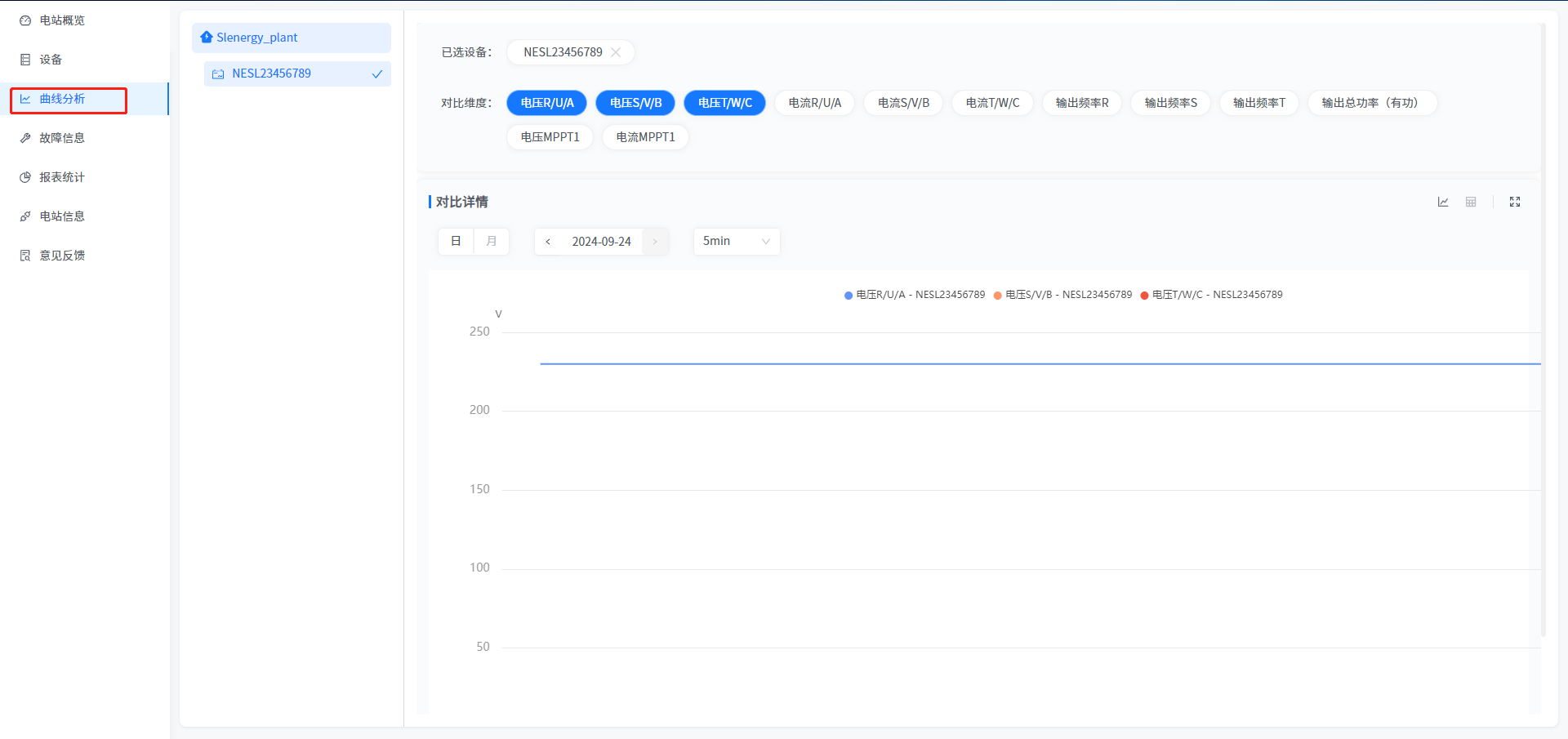 本系统支持您查看您名下电站设备发电功率情况,支持您比对当前时间或者历史时间的设备发电功率情况。您可以点击多个设备,将其统计在折线图中,对比两者之间的发电情况。